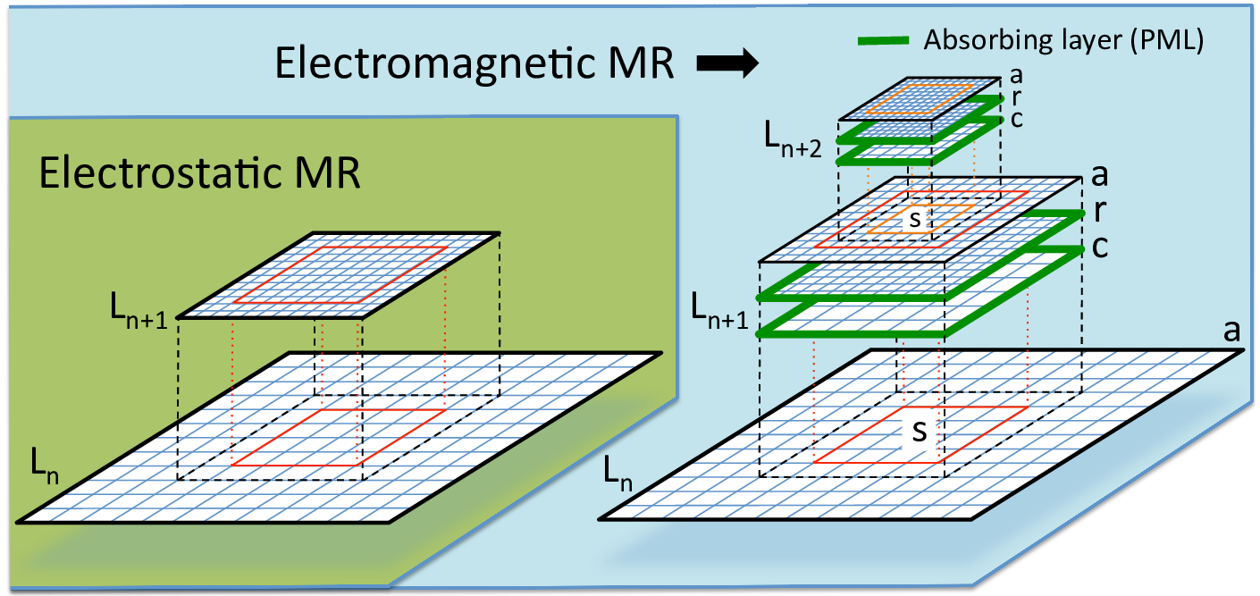 To circumvent this issue, an additional coarse patch (with the same resolution as the parent grid) is added, as shown in Fig. 40 and described in Vay et al. [6]. Both the fine and the coarse grid patches are terminated by Perfectly Matched Layers, reducing wave reflection by orders of magnitude, controllable by the user [7, 8]. The source current resulting from the motion of charged macroparticles within the refined region is accumulated on the fine patch and is then interpolated onto the coarse patch and added onto the parent grid. The process is repeated recursively from the finest level down to the coarsest. The Maxwell equations are then solved for one time interval on the entire set of grids, by default for one time step using the time step of the finest grid. The field on the coarse and fine patches only contain the contributions from the particles that have evolved within the refined area but not from the current sources outside the area. The total contribution of the field from sources within and outside the refined area is obtained by adding the field from the refined grid \(F(r)\), and adding an interpolation \(I\) of the difference between the relevant subset \(s\) of the field in the parent grid \(F(s)\) and the field of the coarse grid \(F( c )\), on an auxiliary grid \(a\), i.e. \(F(a)=F(r)+I[F(s)-F( c )]\). The field on the parent grid subset \(F(s)\) contains contributions from sources from both within and outside of the refined area. Thus, in effect, there is substitution of the coarse field resulting from sources within the patch area by its fine resolution counterpart. The operation is carried out recursively starting at the coarsest level up to the finest. An option has been implemented in which various grid levels are pushed with different time steps, given as a fixed fraction of the individual grid Courant conditions (assuming same cell aspect ratio for all grids and refinement by integer factors). In this case, the fields from the coarse levels, which are advanced less often, are interpolated in time.