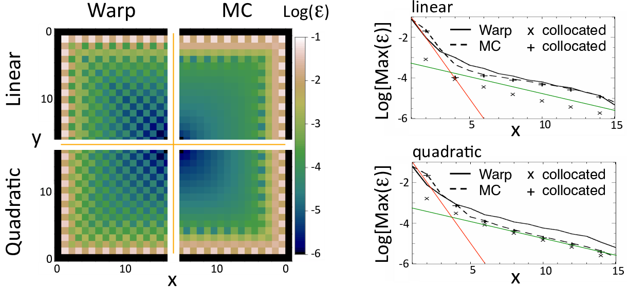 Fig. 42 (left) Maps of the magnitude of the spurious self-force \(\epsilon\) in arbitrary units within one quarter of the refined patch, defined as \(\epsilon=\sqrt{(E_x-E_x^{ref})^2+(E_y-E_y^{ref})^2}\), where \(E_x\) and \(E_y\) are the electric field components within the patch experienced by one particle at a given location and \(E_x^{ref}\) and \(E_y^{ref}\) are the electric field from a reference solution. The map is given for the WarpX and the MC mesh refinement algorithms and for linear and quadratic interpolation at the patch refinement boundary. (right) Lineouts of the maximum (taken over neighboring cells) of the spurious self-force. Close to the interface boundary (x=0), the spurious self-force decreases at a rate close to one order of magnitude per cell (red line), then at about one order of magnitude per six cells (green line).