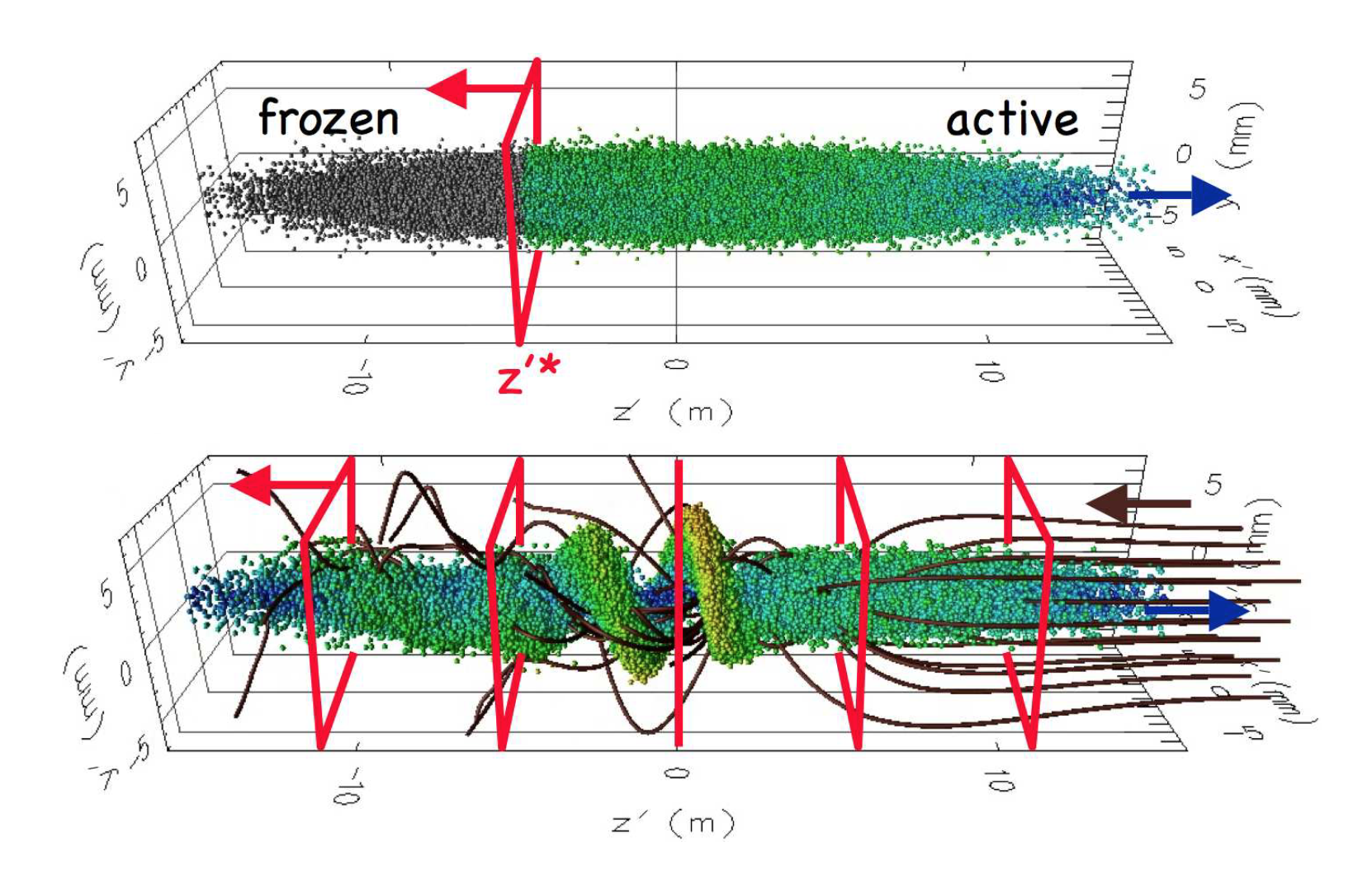 Fig. 44 (top) Snapshot of a particle beam showing “frozen” (grey spheres) and “active” (colored spheres) macroparticles traversing the injection plane (red rectangle). (bottom) Snapshot of the beam macroparticles (colored spheres) passing through the background of electrons (dark brown streamlines) and the diagnostic stations (red rectangles). The electrons, the injection plane and the diagnostic stations are fixed in the laboratory plane, and are thus counter-propagating to the beam in a boosted frame.